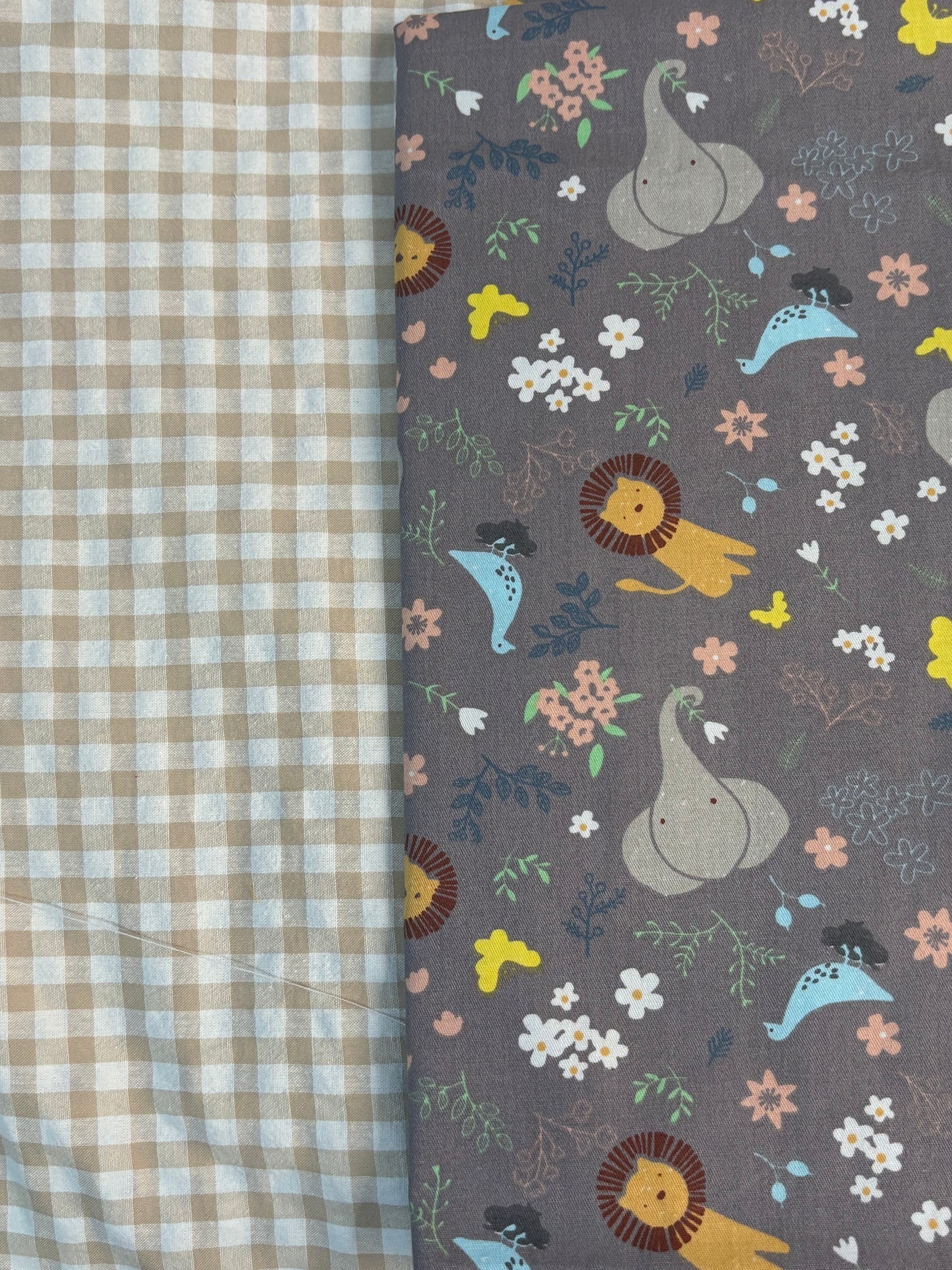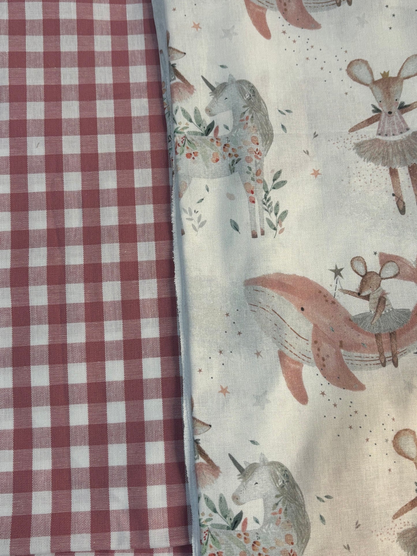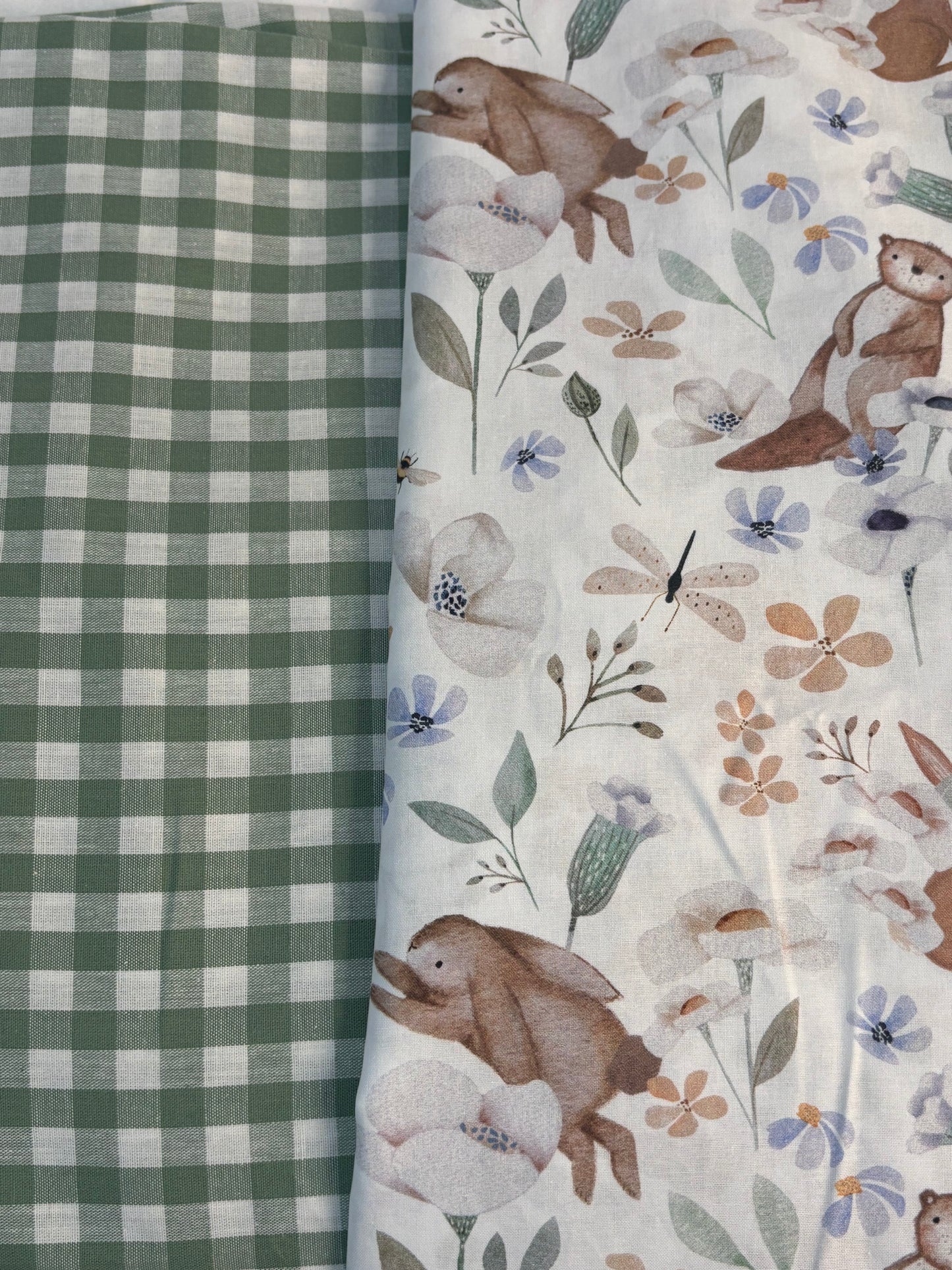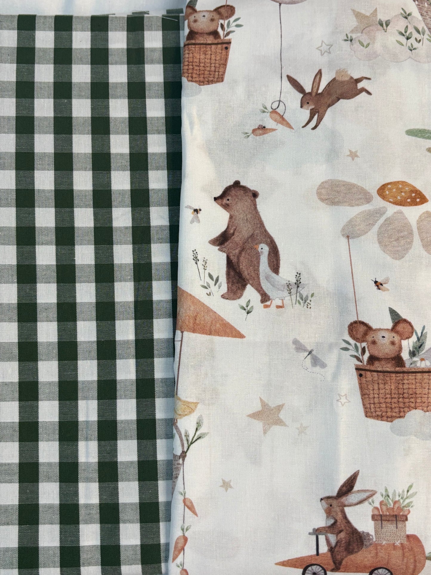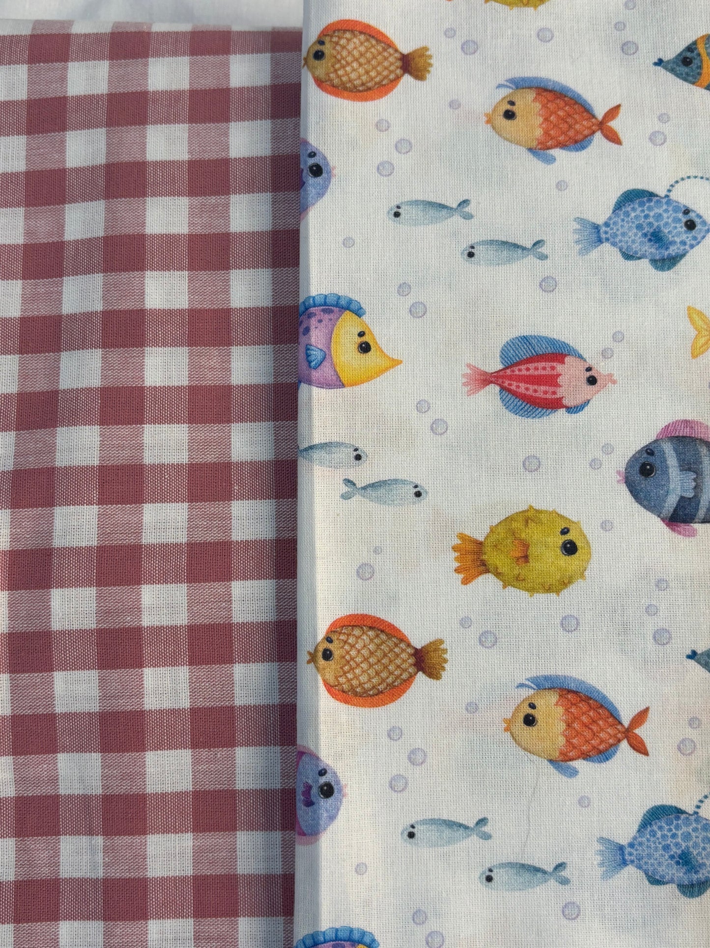 Ao escoller a combinación, o mandilón será confeccionado coa tela da esquerda, e os bolsillos serán da tela da dereita (tal e como se ve nas fotos)
